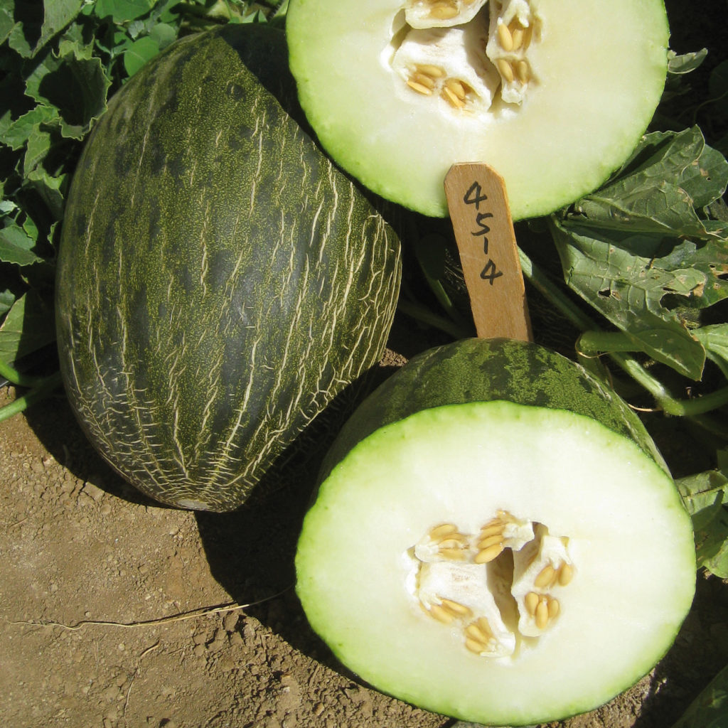 Oval fruits 2 kg average, green skin with dark spots and limited netting.